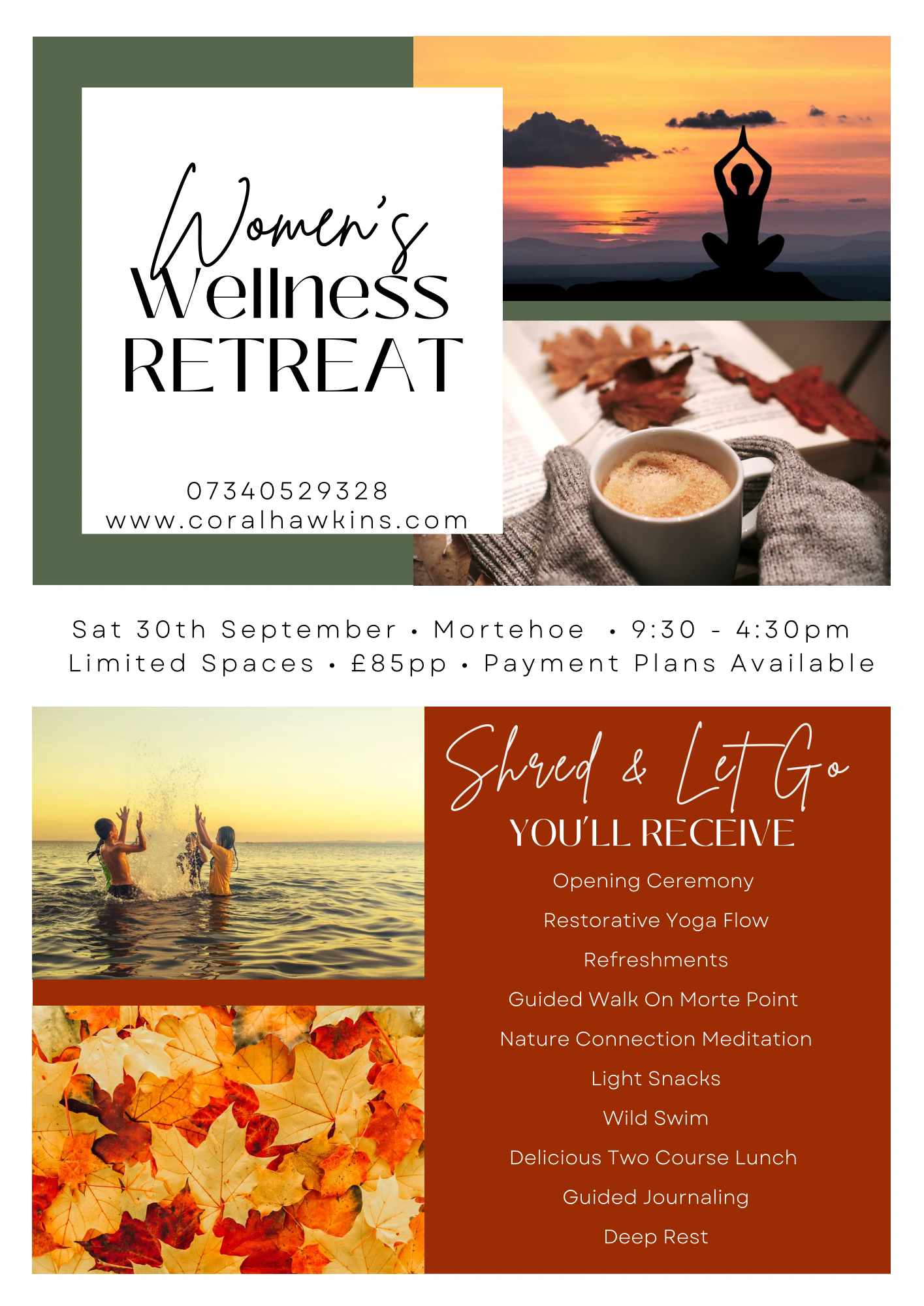 "Wow what a day! I went on Corals wonderful Autumn retreat day and it was soooooo lovely. I felt so welcome and relaxed the moment I walked through the door. Her lovely meditation and yoga flow followed by a mindfulness walk and wild dip in the sea were amazing. The lunch was also very yummy! I was blessed with such a lovely group of ladies...we shared laughter, tears, silence, food, friendship ❤️ would highly recommend her retreats....THANK YOU CORAL!"Esther Cadwallender